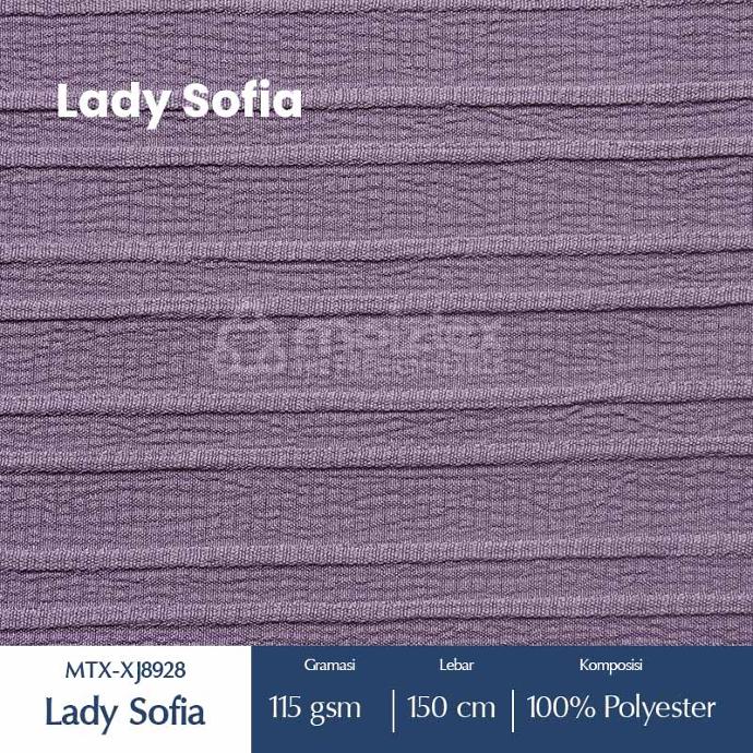 Kain Lady Sofia memiliki tekstur kain yang unik karena terdapat bubble kecil dan salur-salur (garis) memanjang yang terlihat menarik. Memiliki pilihan warna yang variatif. Cocok untuk cuaca panas karena bahan yang tidak terlalu tebal dan mampu menyerap keringat. Kain ini cocok untuk dibuat berbagai jenis atasan, dress maupun bawahan.