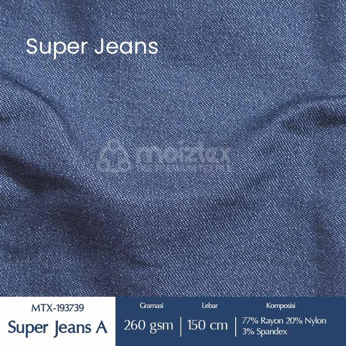 Kain Super Jeans adalah kain jeans dengan kualitas super yang memberikan kenyamanan karena teksturnya yang lebih halus, super stretch, nyaman dan ringan. Cocok untuk dibuat berbagai jenis celana wanita, Rok dan baju anak-anak. Pilihan yang cocok untuk para pecinta jeans yang mencari produk yang stylish dan tahan lama.